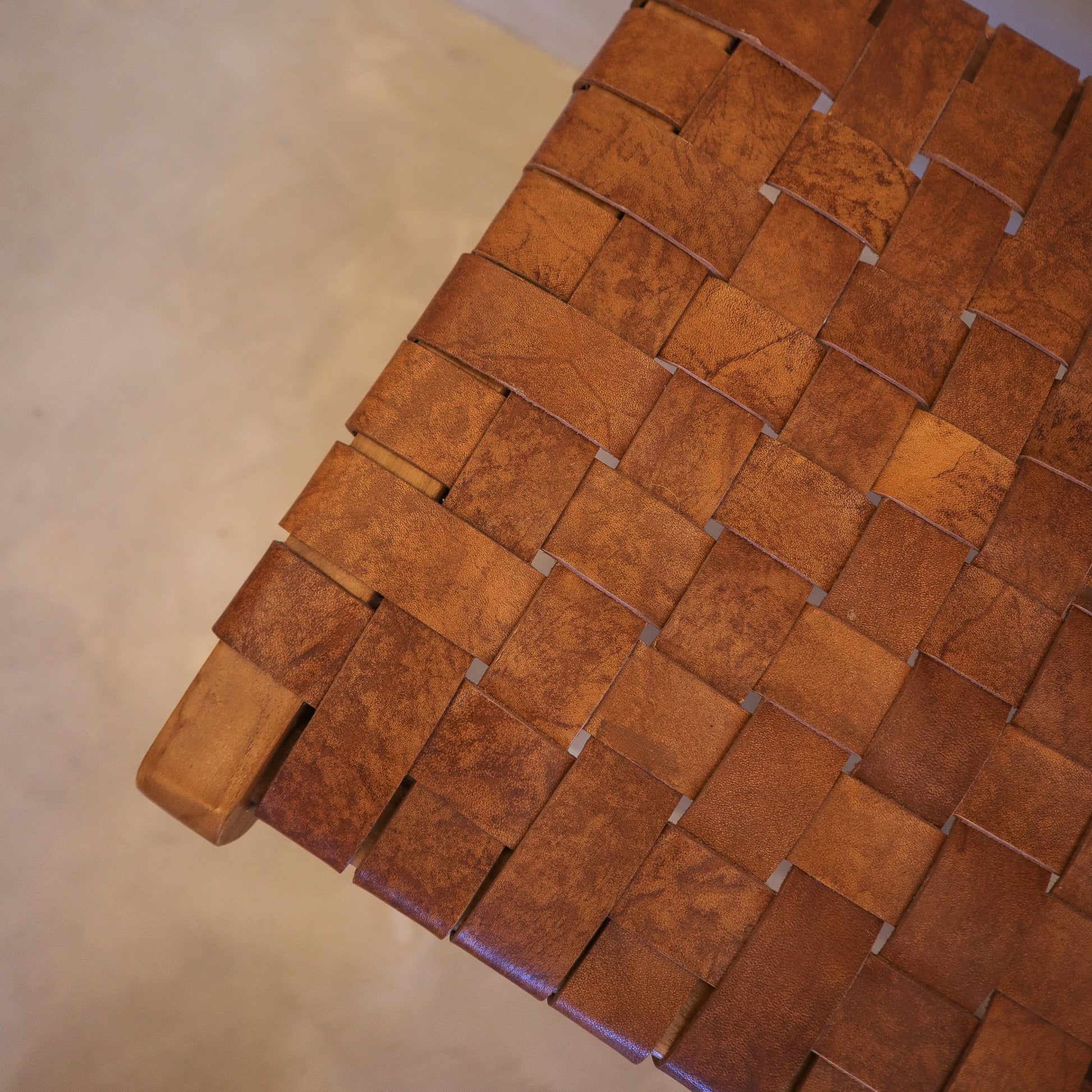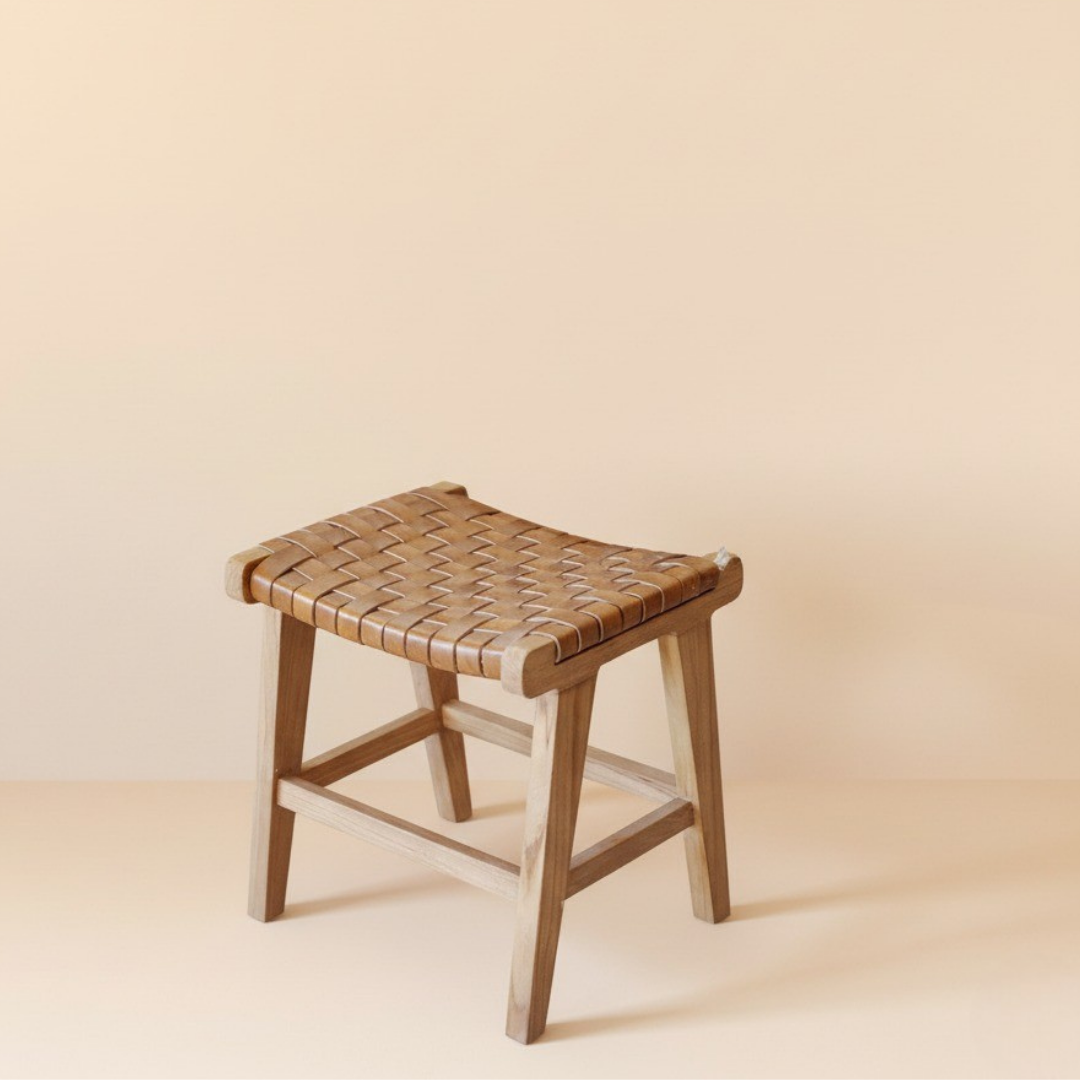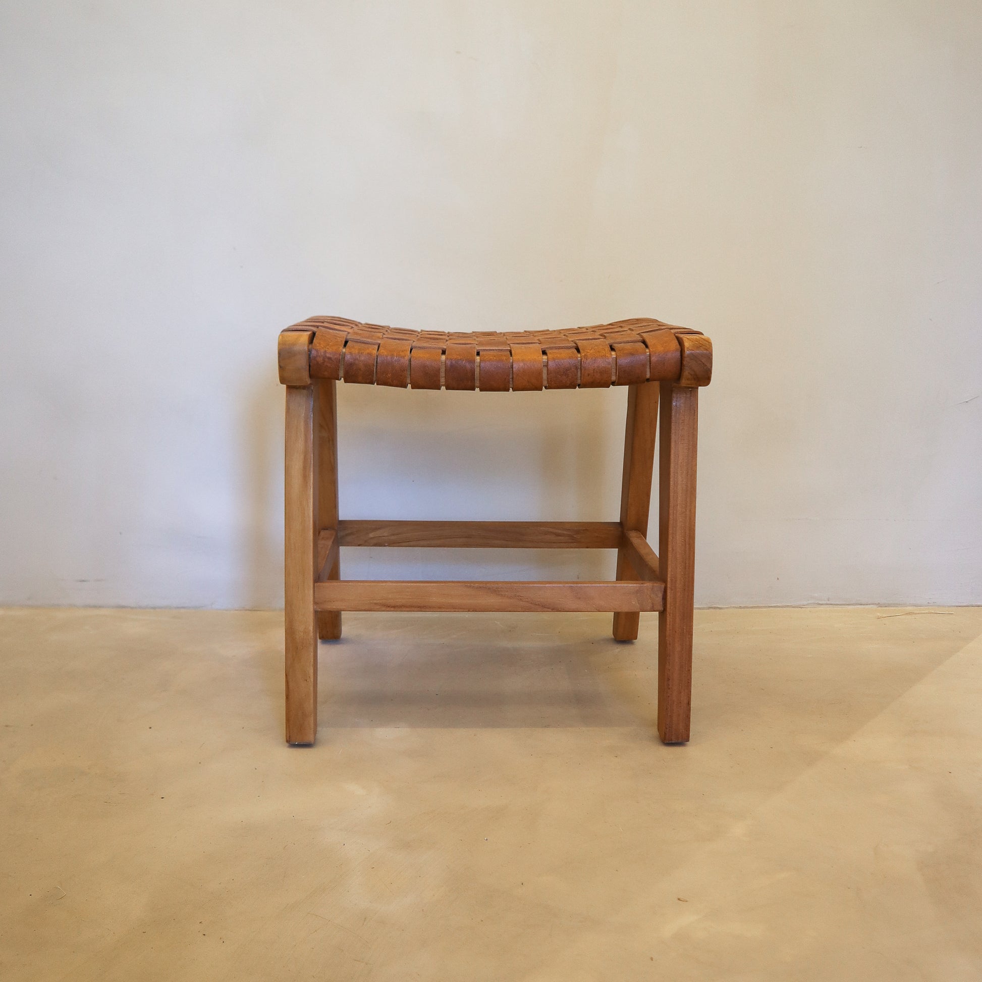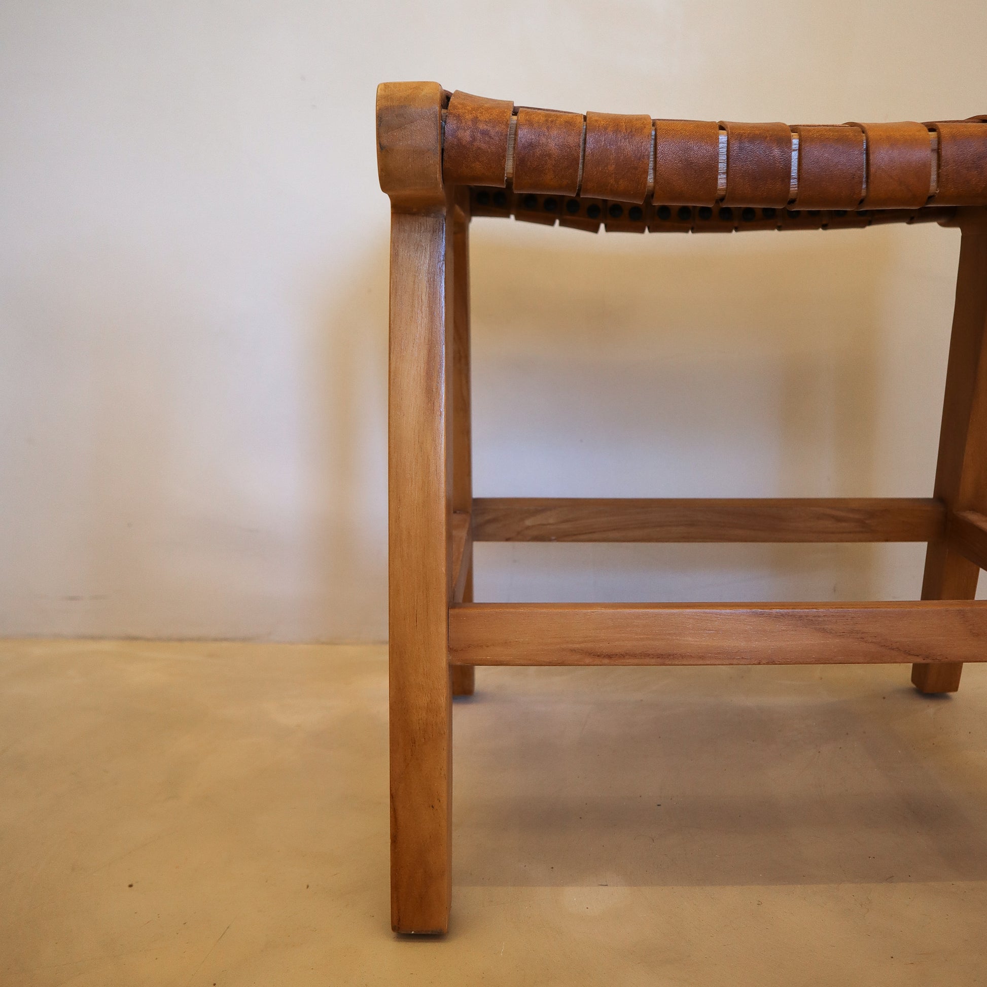 Base de teca, asiento trenzado en cuero vegetal color miel. Ideal al pie de cama o en pasillo.