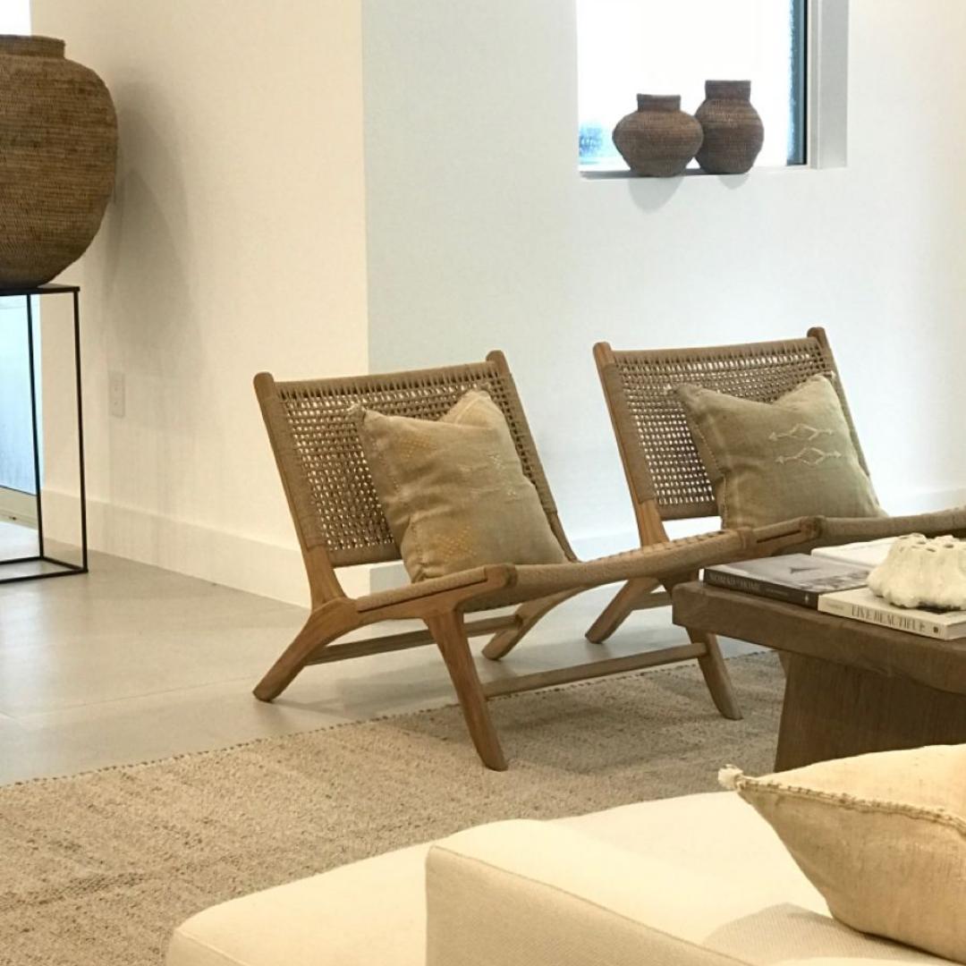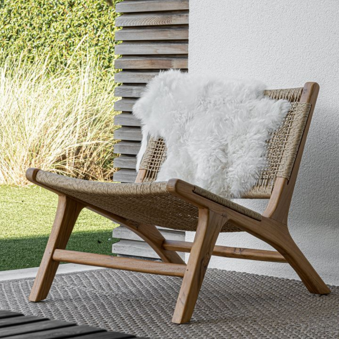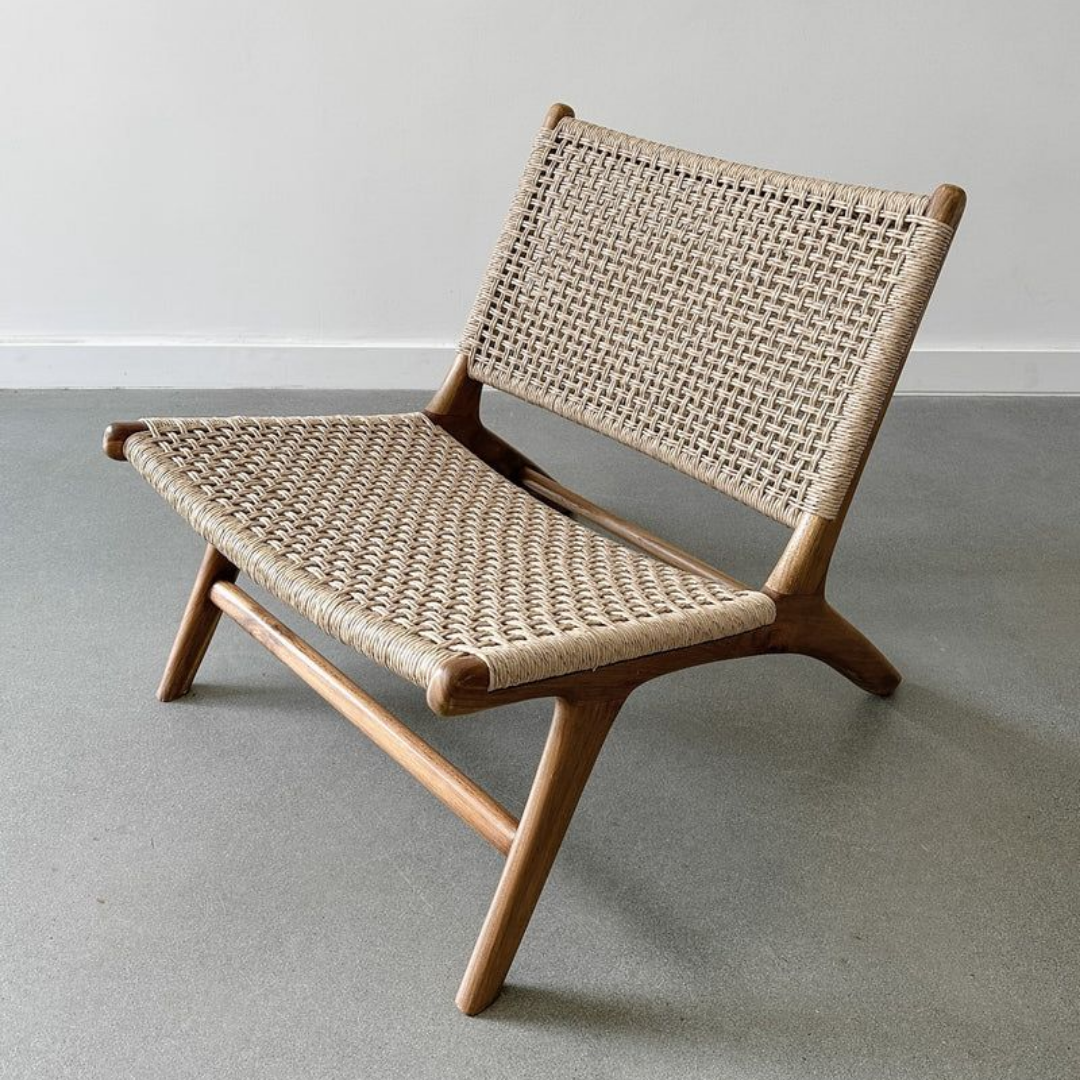 Butaca de teca con respaldo y asiento de sisal entrelazado. Liviana, estilo vintage.