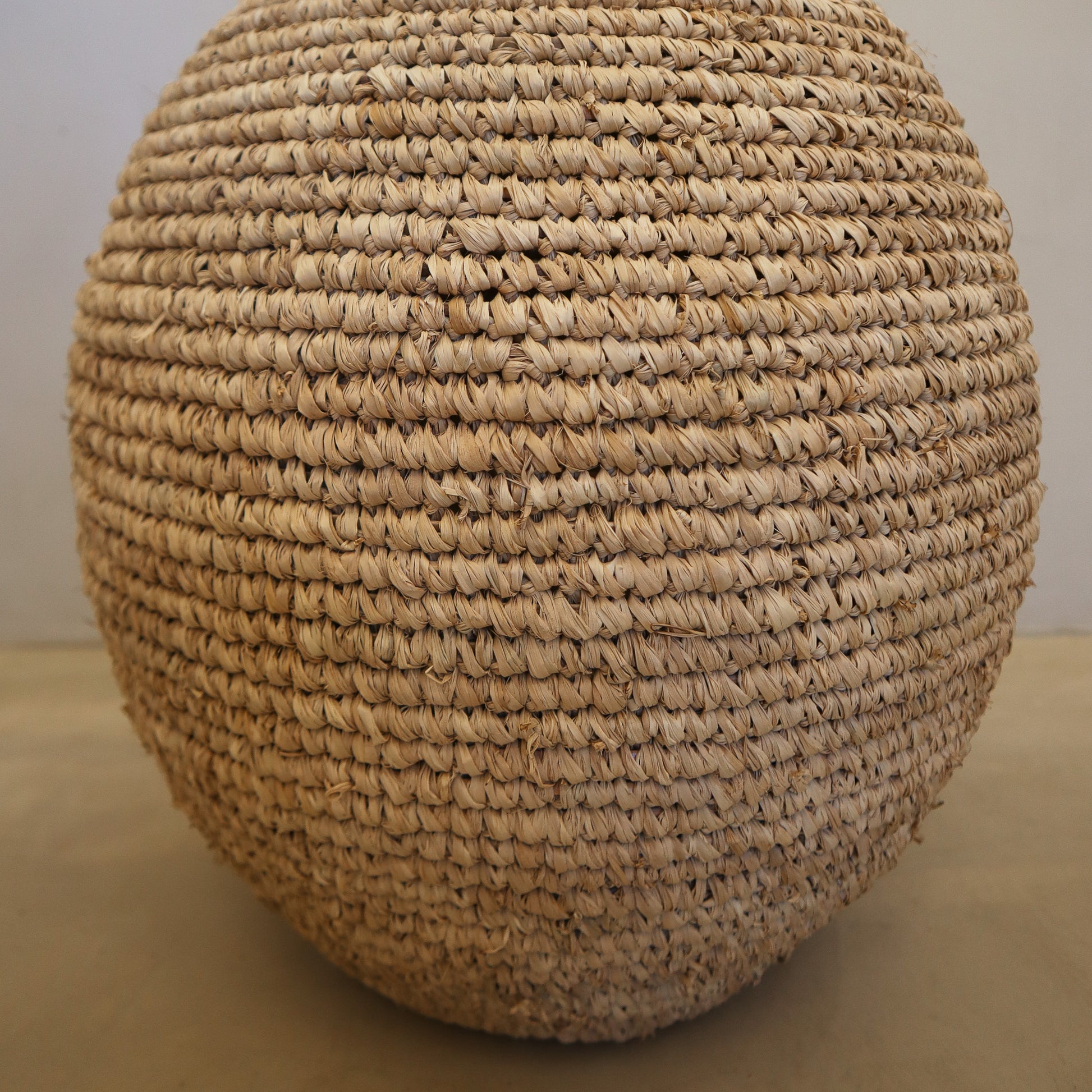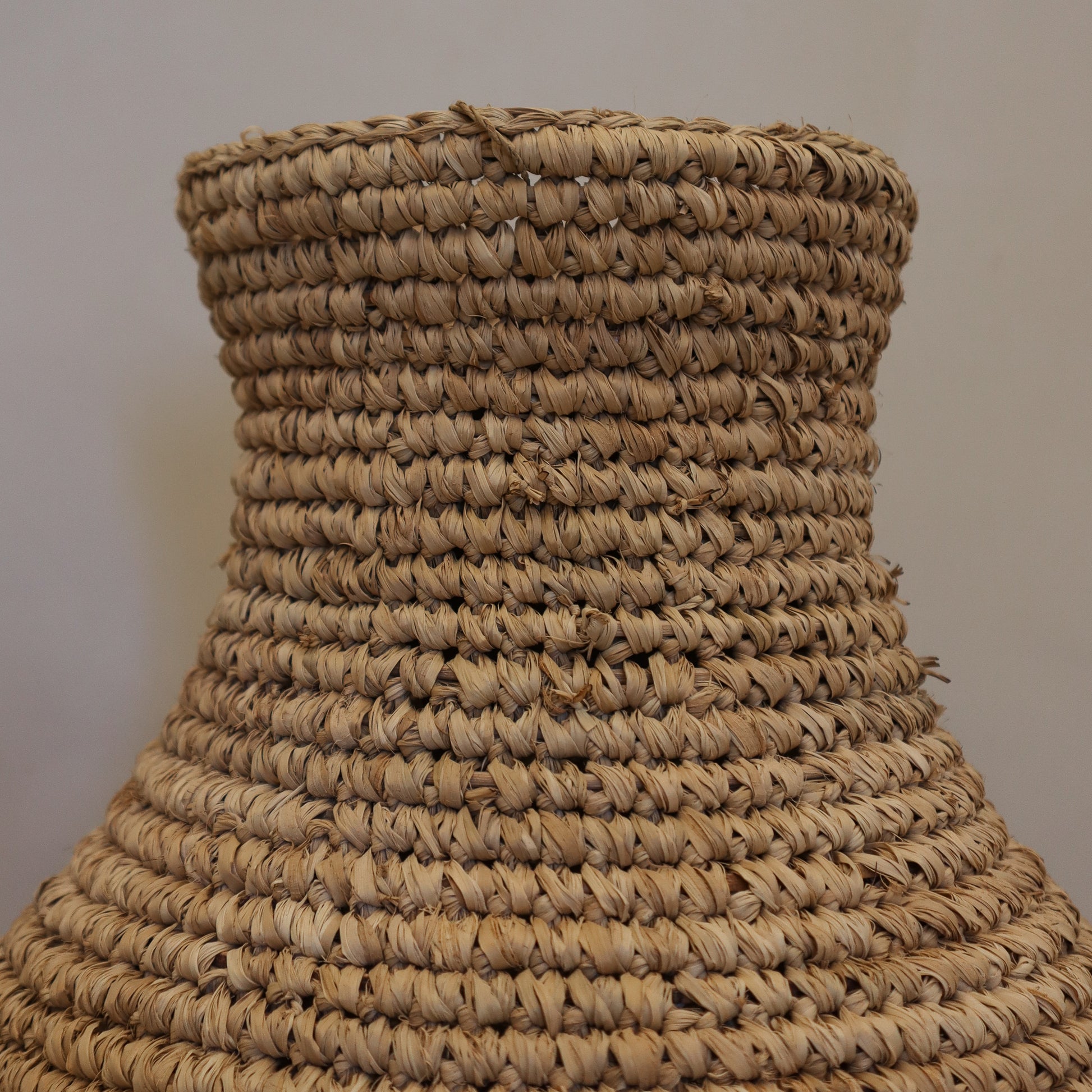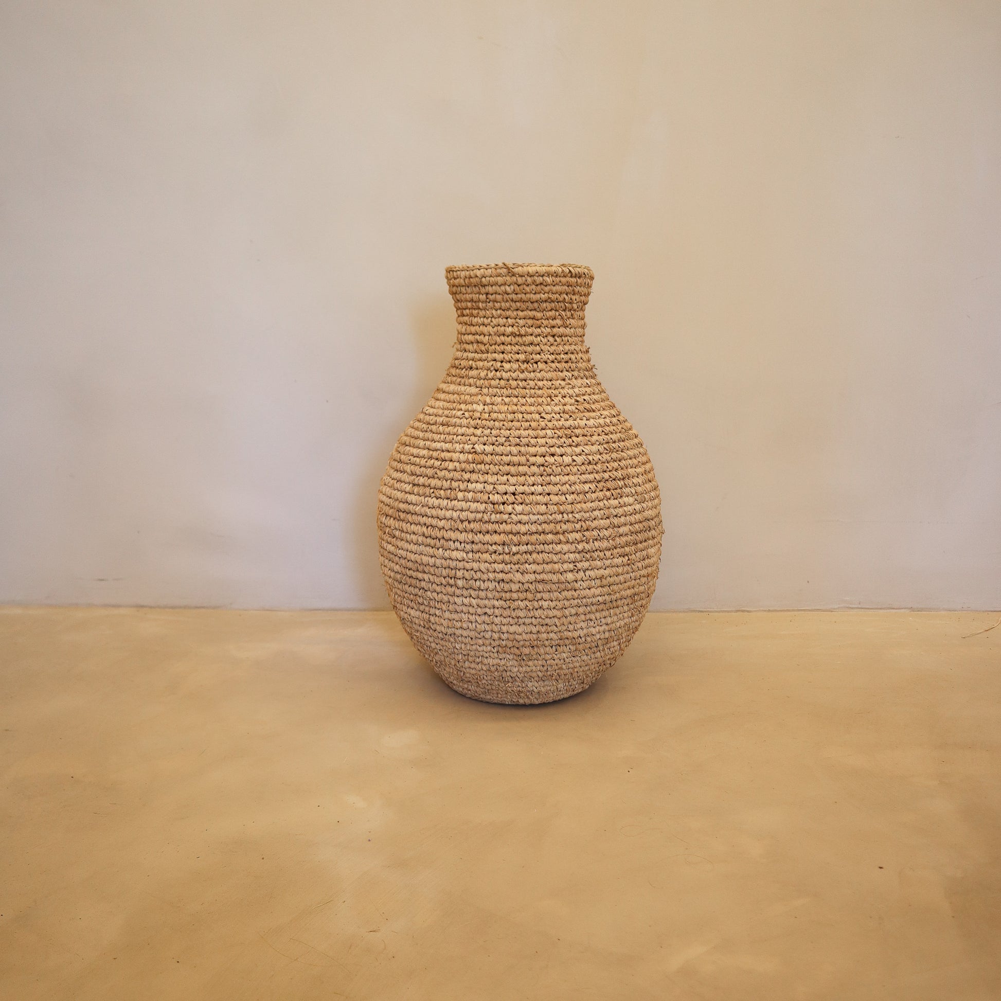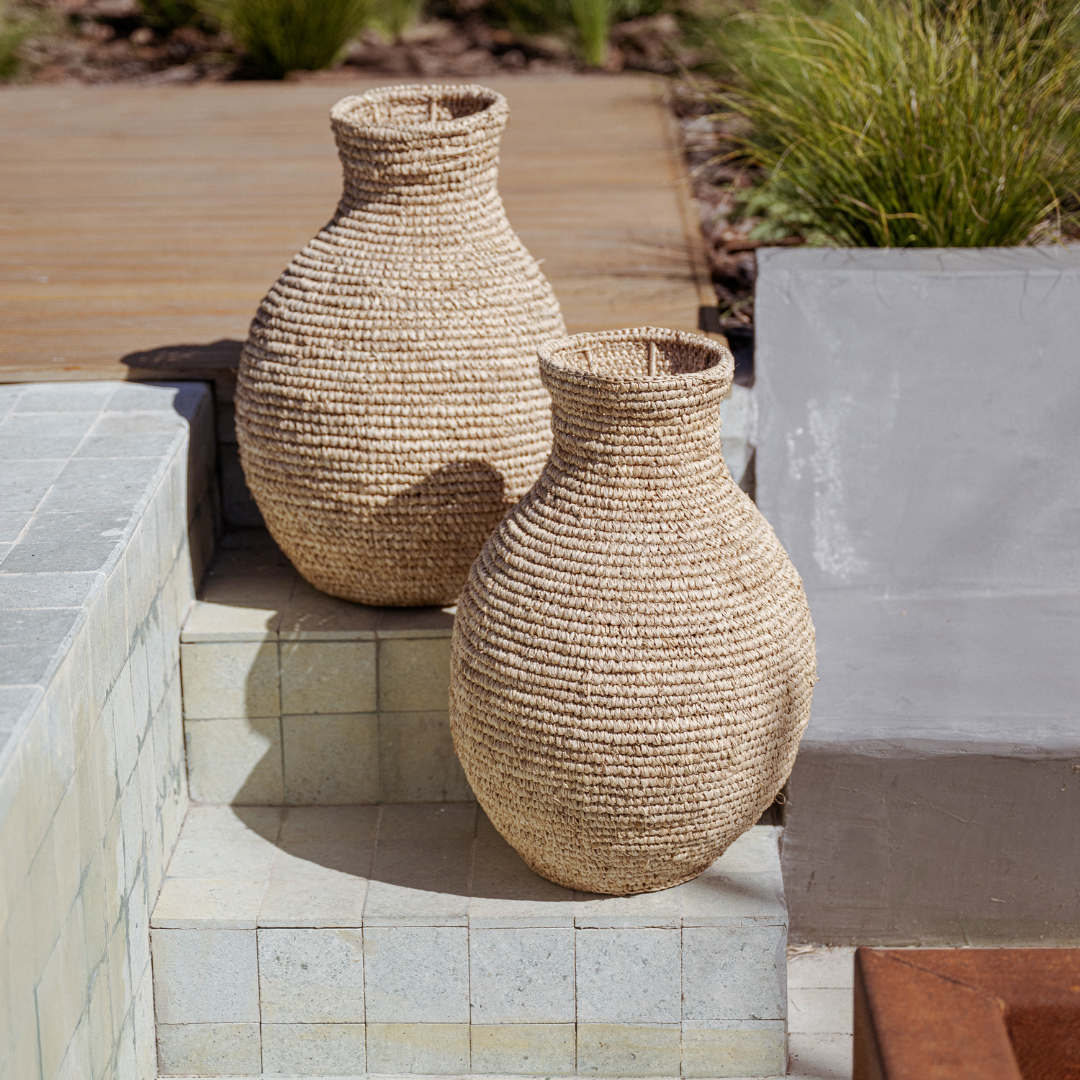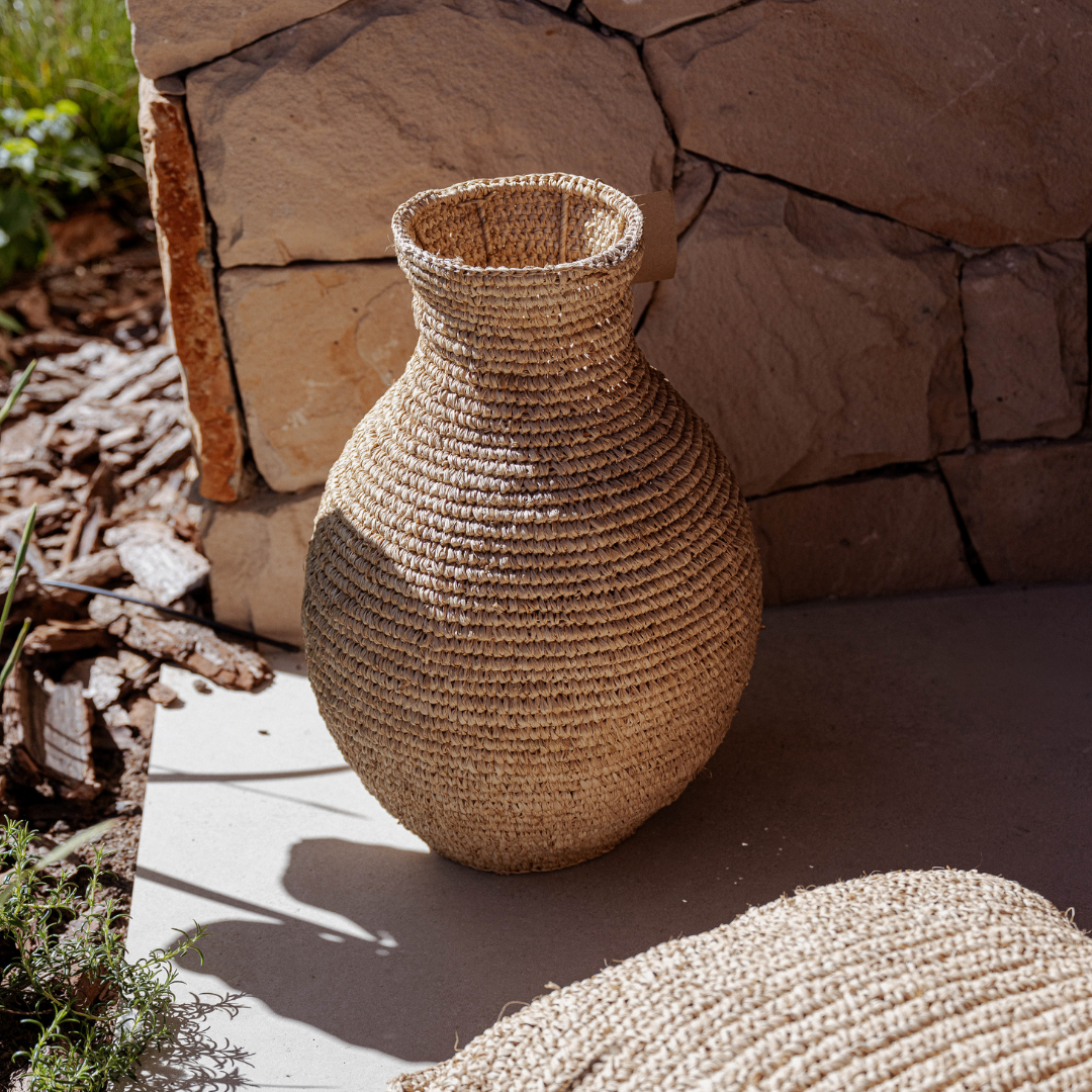 Jarrón cilíndrico forrado en sisal. Queda bien con ramas secas o flores artificiales.