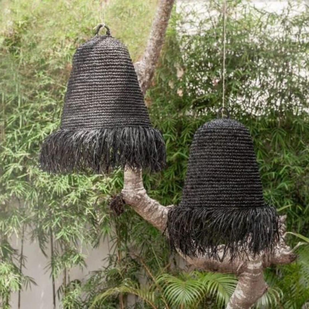 Colgante con tejido cerrado y flecos sutiles. Luz cálida y uniforme para espacios amplios.