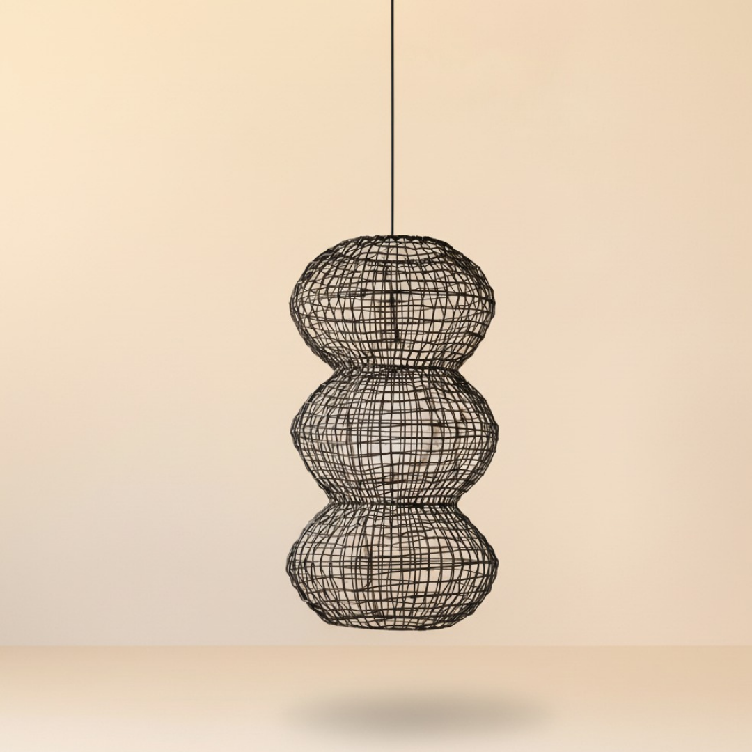 Colgante de ratán tejido. Suma volumen y textura sobre la mesa del comedor.