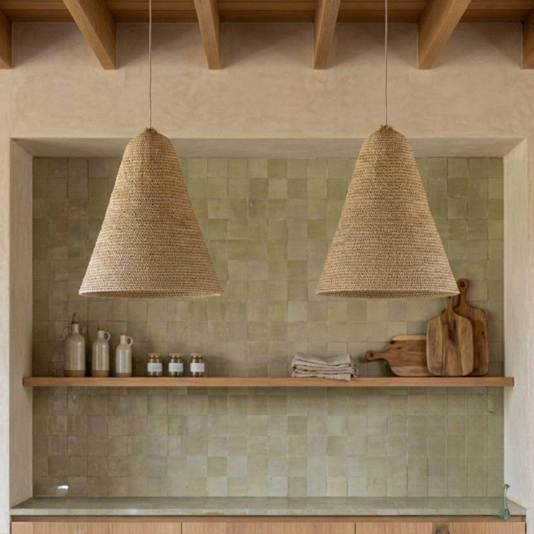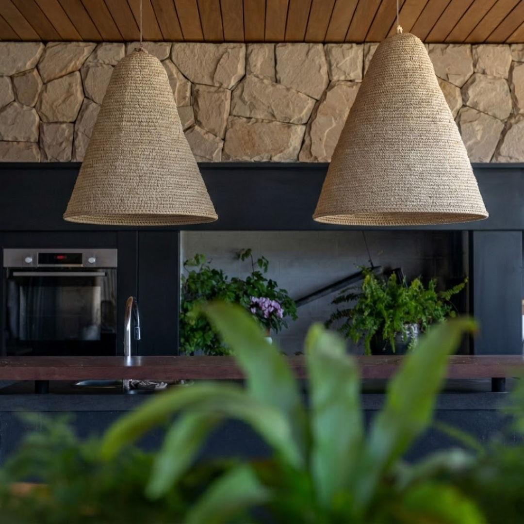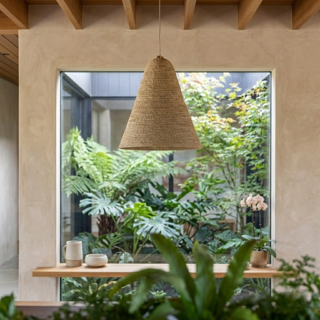 Colgante con tejido cerrado. Luz cálida y uniforme para espacios amplios.