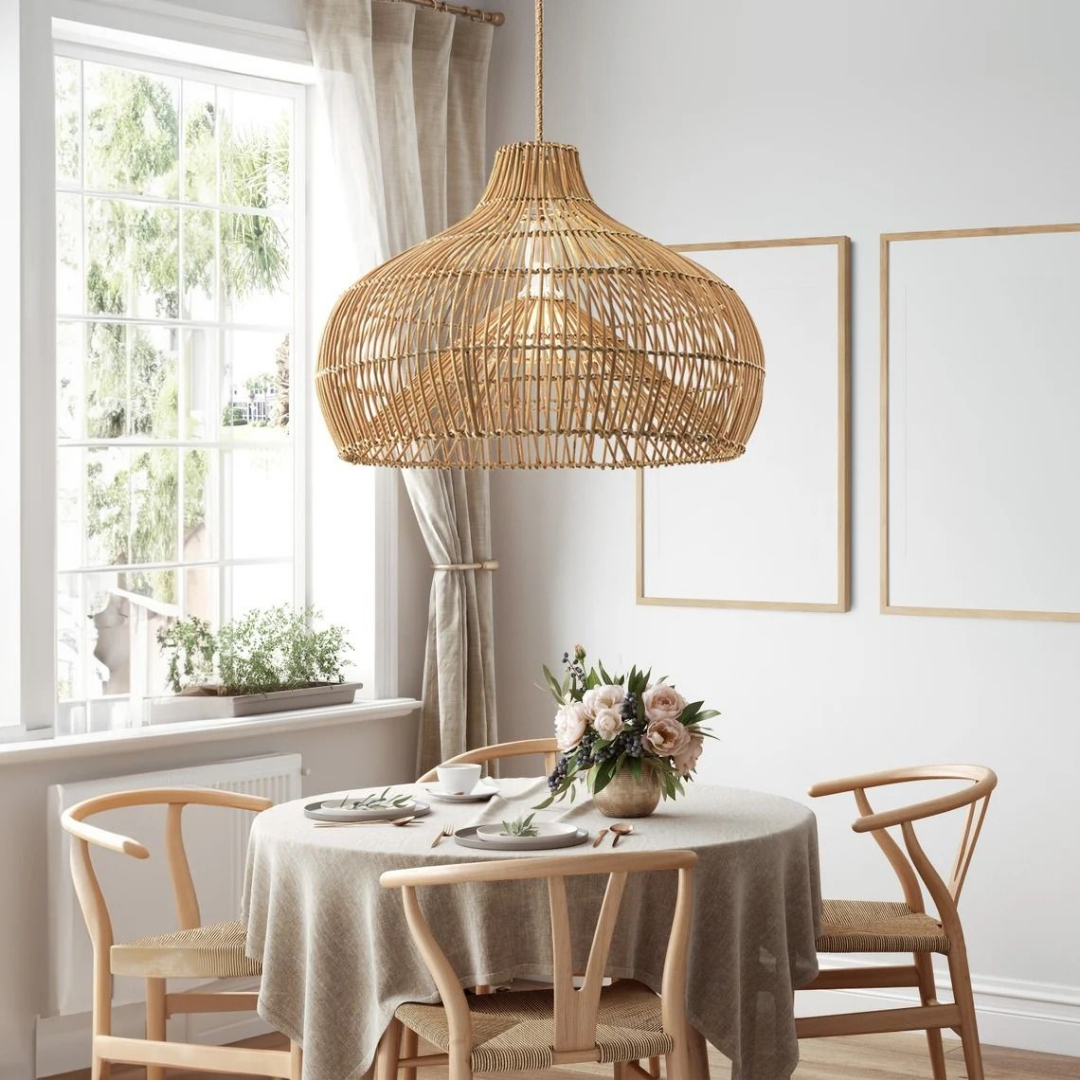 Hecha con finas tiras de ratán tejidas a mano, esta lámpara colgante natural se convierte en el centro de atención de cualquier ambiente. Su diseño único proyecta una luz especial, creando una atmósfera cálida y encantadora en el espacio que ilumina.