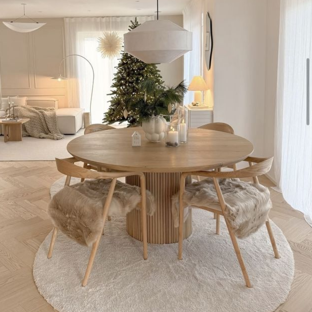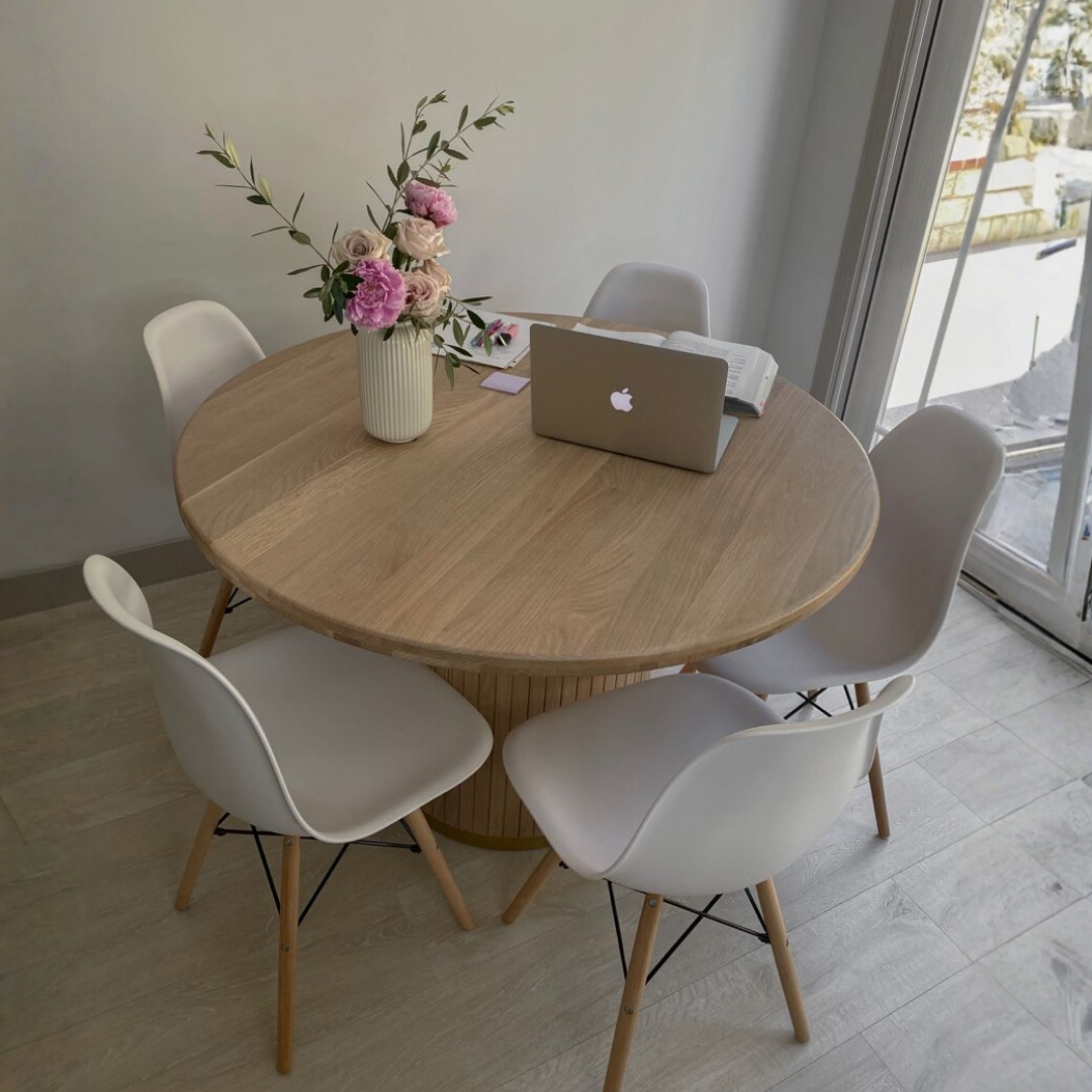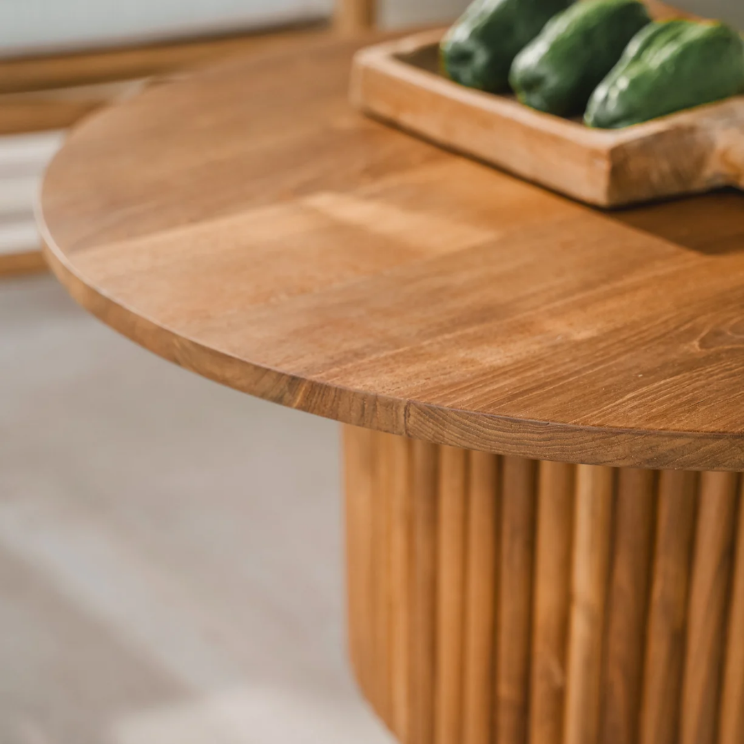 Mesa de comedor redonda Luma de teca con base estriada. Cuidadosamente elaborada por nuestros artesanos en Bali, la mesa de comedor Luma es una pieza duradera y resistente, pensada para acompañar cualquier ambiente por muchos años. Su diseño elegante se integra fácilmente con todo tipo de decoración, aportando un toque de estilo y calidez al espacio.
