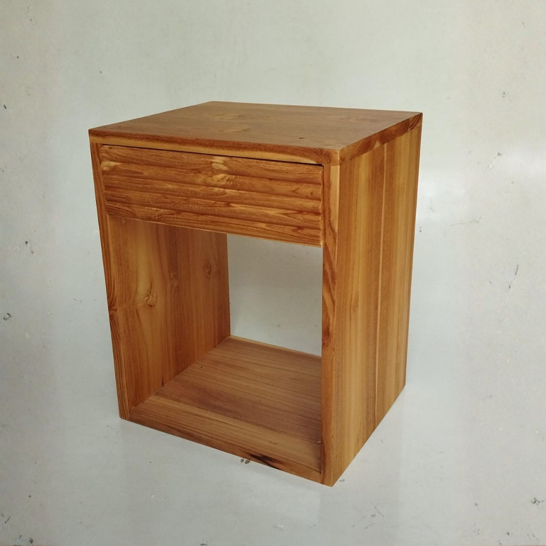 Mesa de luz en teca maciza, con un cajón corredizo y repisa inferior