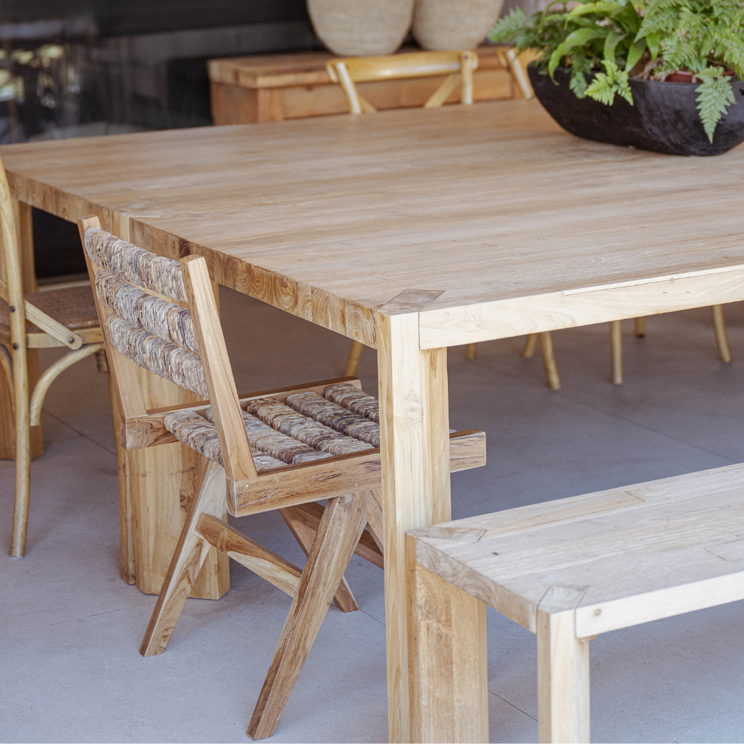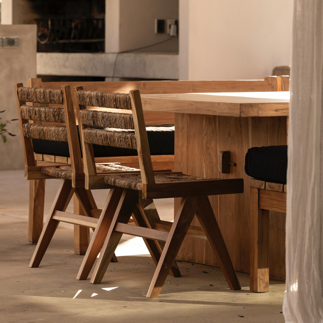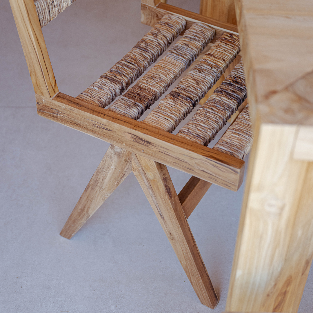 Silla de madera clara con respaldo y asiento oval forrado con fibra de banana. Perfecta para comedor o escritorio.